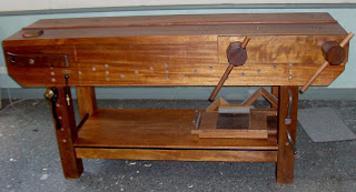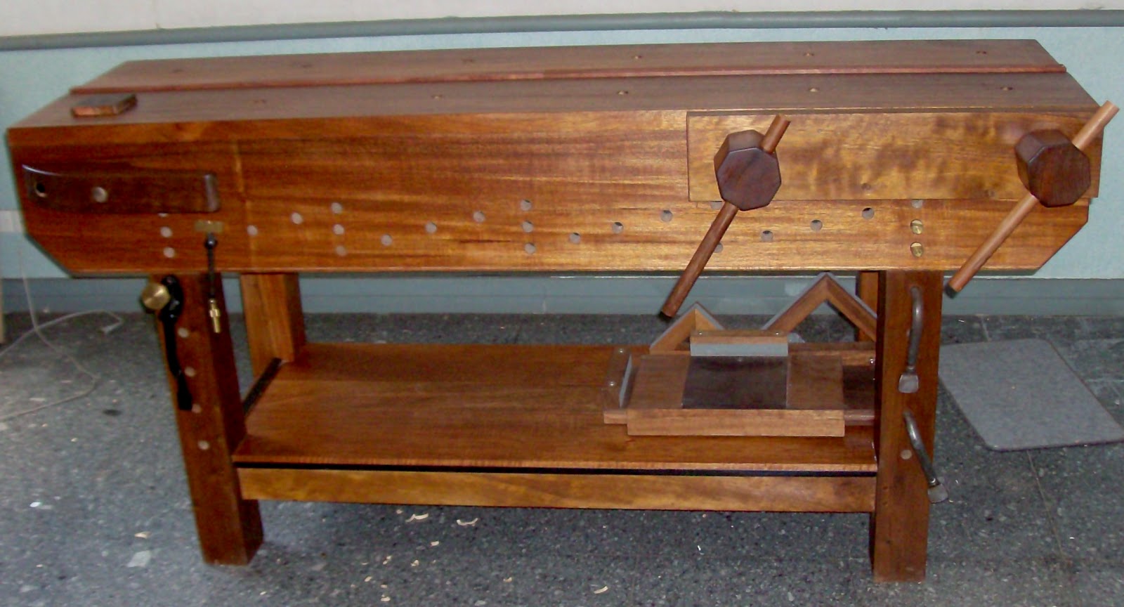 Time flies when..... Unbelievable to think that it has been 20 years since I built this first bench. Although truthfully from start of build to final was close to 5 years!   A lot of interruptions in between.  This bench was built like a monster and if I do say so myself it is beautiful.  The top was Laminated Maple, end skirts and twin screw from Padauk, side skirts Walnut, trestle legs and stretchers from Red Oak,  a twin screw vise cover from Birds Eye Maple, Ebony turned handles for the vise, and just for good measure throw in some Lacewood accents inlaid into the Walnut side board.  This was of course at that time basically a 100% power tool project.  I think the only had tools used were some mortise chisels to cut the through tenons for the stretchers.  Additionaly this bad boy has 4 - 3/8" threaded stainless steel rods running laterly inside the laminated top.  Now for the funny story, after it was all finished, I was afraid to use it!  Did not want to dent or scratch it, afraid to get glue on it, ect. ect.  But obviously it did get some use after the 'new car syndrome" wore off.  I still own the bench and it is sitting in a basement shop in New York to this day.  It is still rock solid and still flat as can be.  Guess all the over-engineering at the time was worth it.